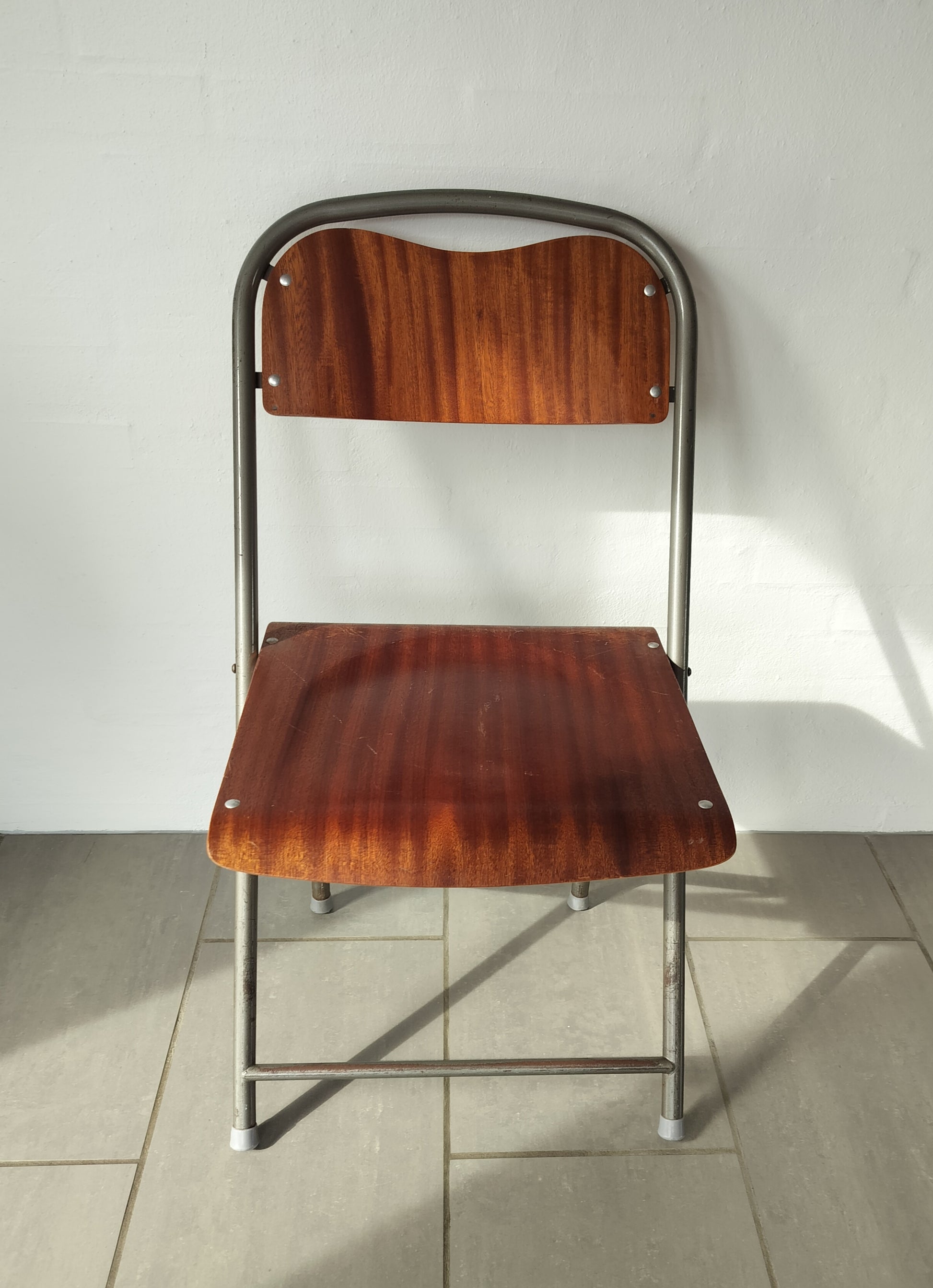 2 skønne klapstole i jernstel med teaktræs (finér) sæde og ryglæn.