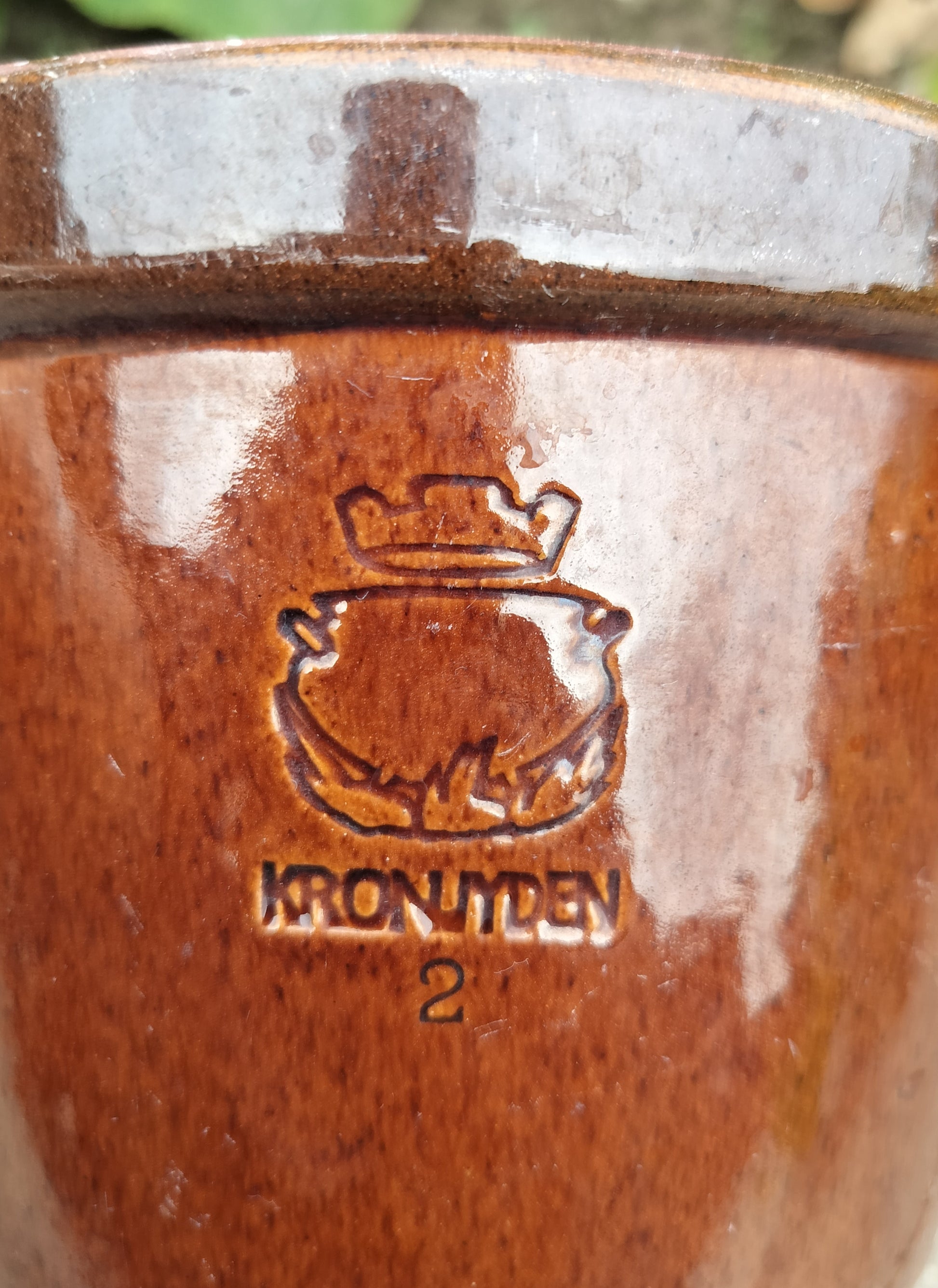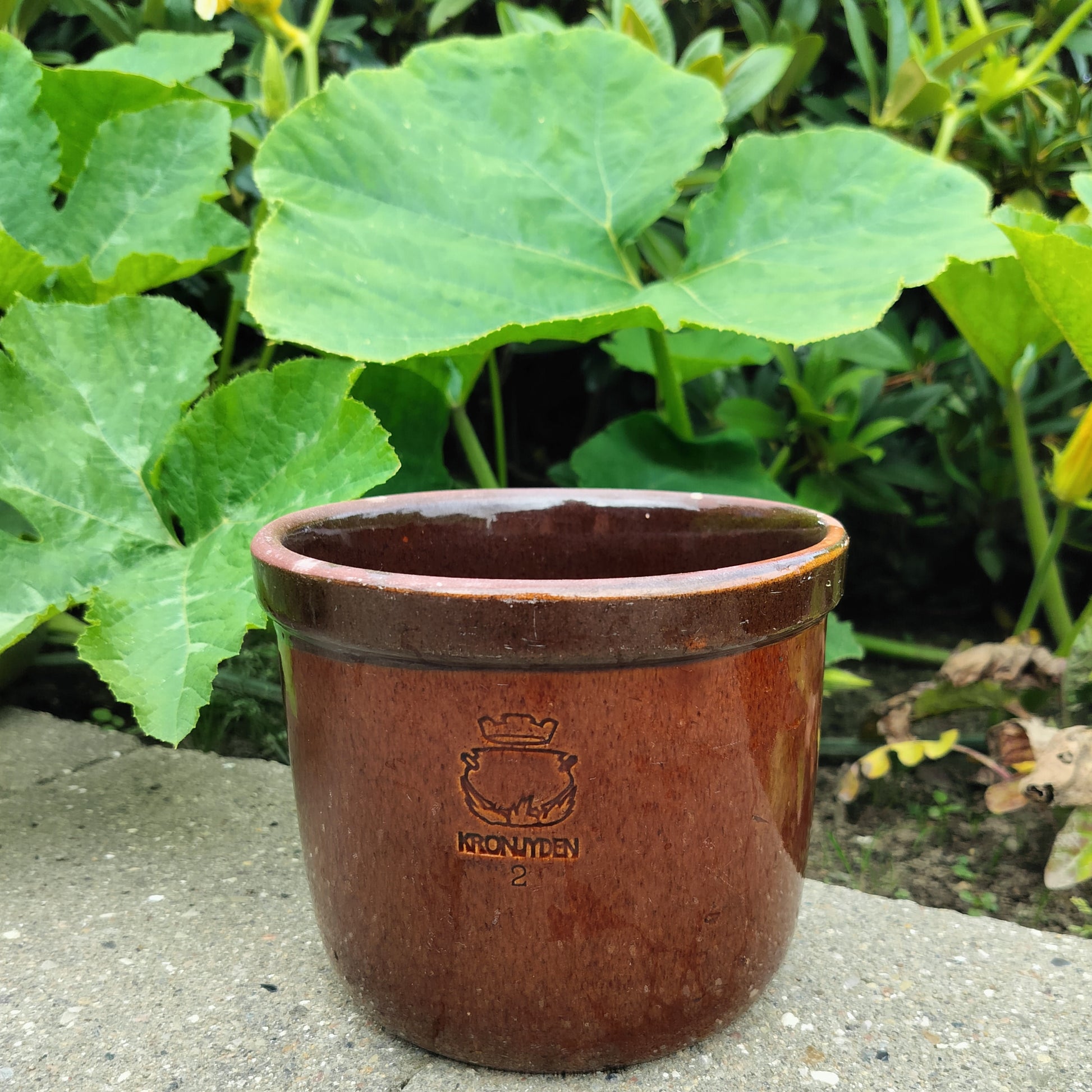Den dybe, mørkebrune farve og det karakteristiske stempel "Kronjyden 2" giver krukken et autentisk vintage look, der passer godt ind i både moderne og traditionelle indretninger. Denne robuste og tidløse syltekrukke er ideel til udendørs brug, hvilket gør den perfekt til din have, altan eller vindueskarm. Det anbefales dog at tage den indendørs i vinterperioden for at den ikke frostsprænges. Placér den strategisk for at skabe en hyggelig og indbydende atmosfære, der byder gæster velkommen med et strejf af nostalgisk elegance.
