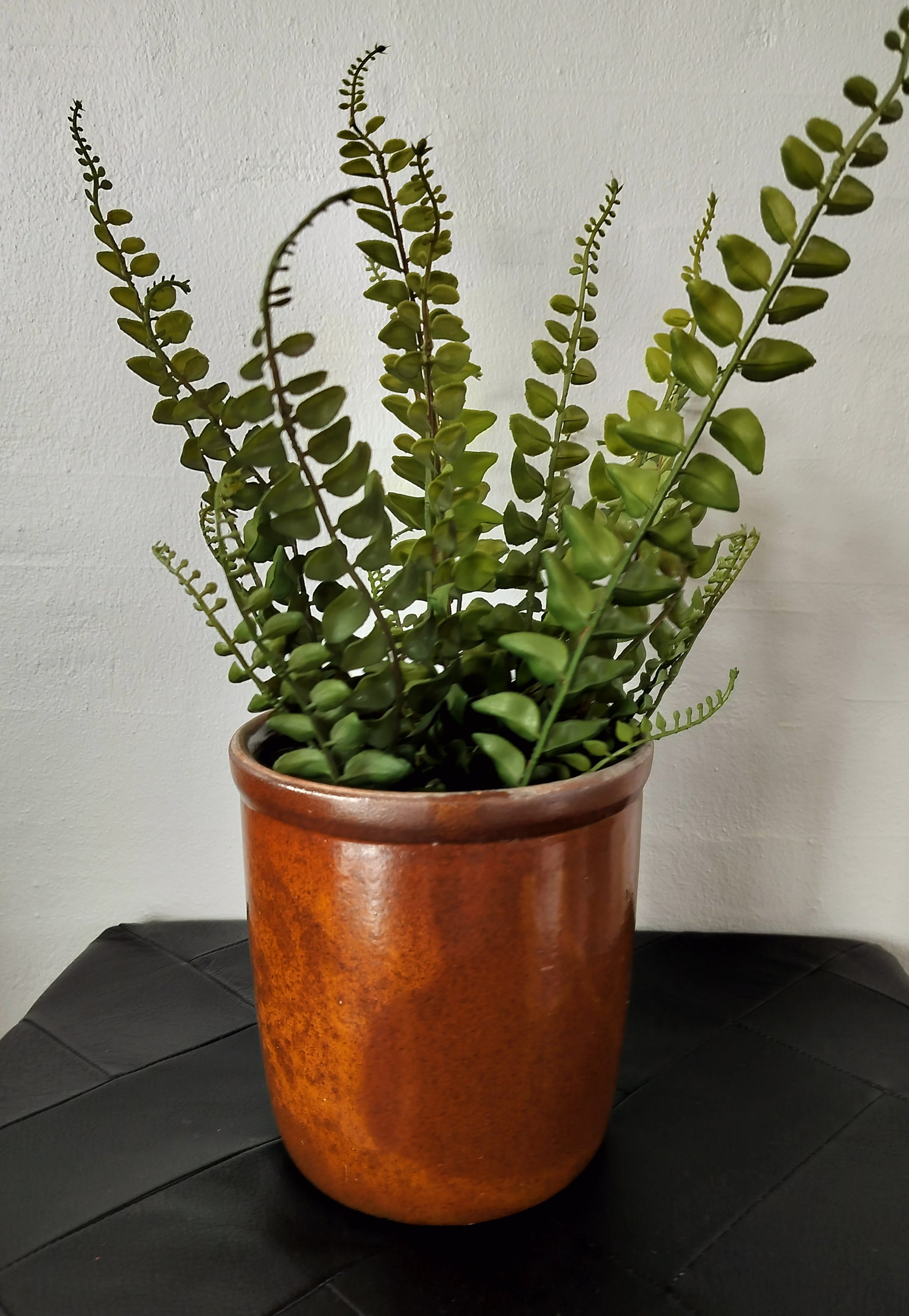 Opdag skønheden i vores super skønne gamle syltekrukke! Med dimensioner på Ø 16 cm x H 17 cm og stemplet "2" er denne krukke ikke kun funktionel, men også en ægte vintage skat. Den har en smuk lys brun rustik glasur, der tilføjer en rustik charme til enhver indretning.